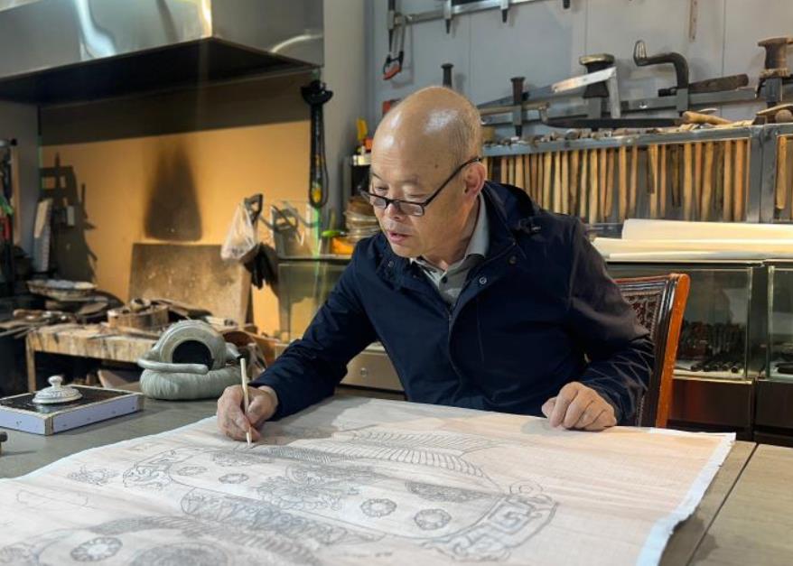 银铜器制作及鎏金技艺国家级代表性传承人何满正在绘图。新华社记者 张子琪 摄