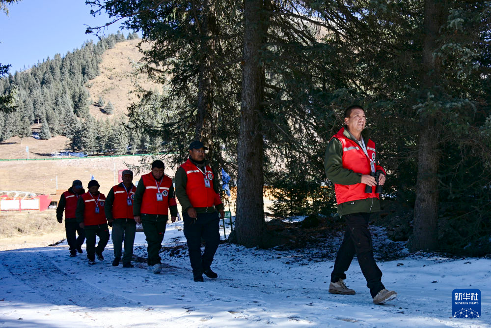 初冬时节,祁连山脉草木渐黄,风大物燥,火险等级较高。祁连县阿咪东索林区护林员踏雪巡山,排查火险隐患,强化火源管控,守护高原林海平安过冬。