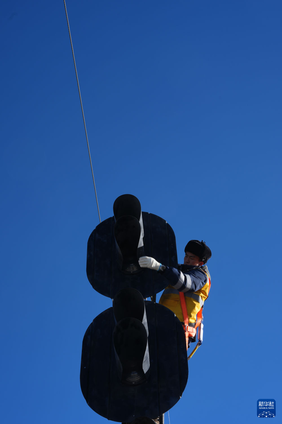 信号工孙伟在哈尔盖信号车间哈尔盖信号工区青海湖站检查信号机灯泡。