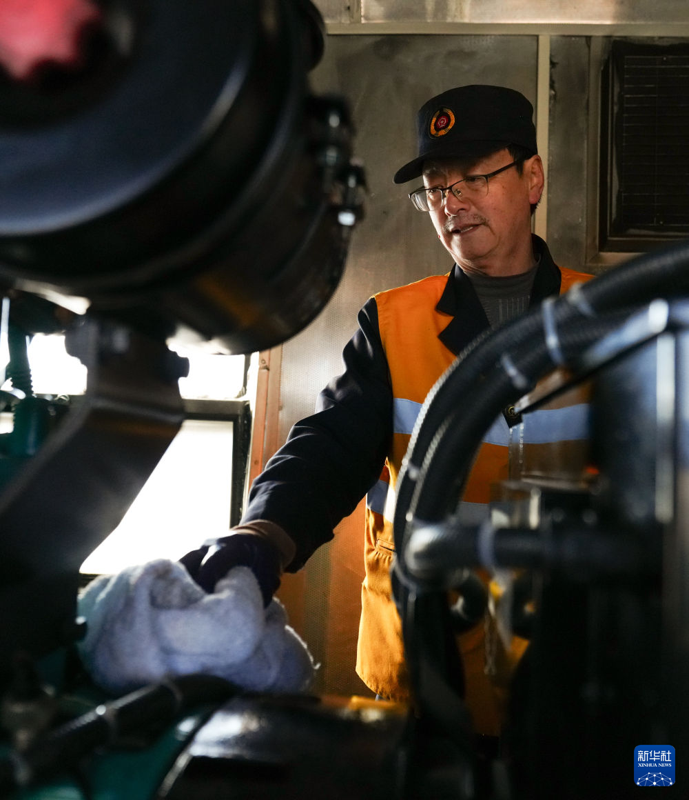 2月4日,韩景泉在放水过程中巡检列车,前面是工区储水井。新华社记者 齐芷玥 摄