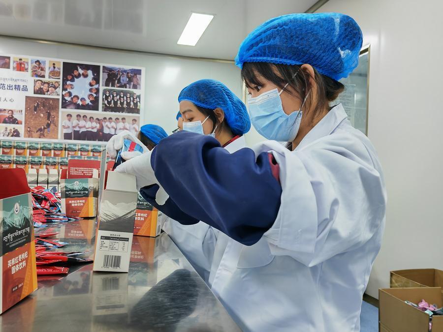 图为囊谦县芫根工厂的工人正在打包芫根红枣枸杞固体饮料。新华社记者 柳泽兴 摄