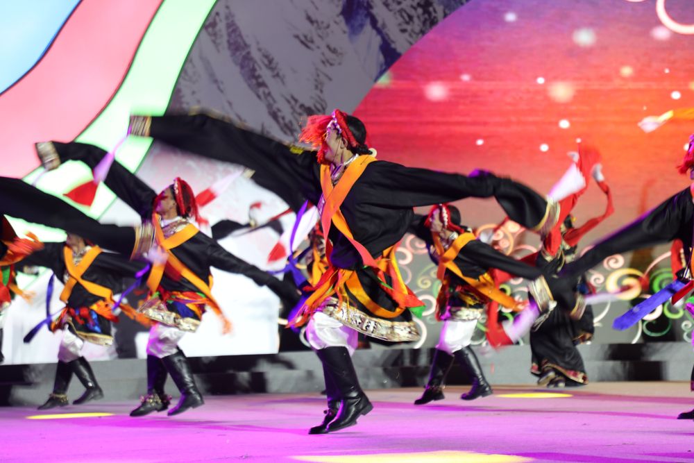 2025年8月1日,在青海省玉树藏族自治州举办的尼泊尔商贸文化交流活动现场,玉树州的舞蹈演员在表演节目。(柳泽兴 摄)