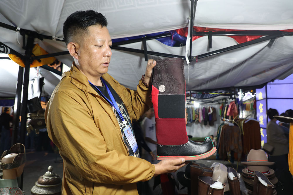 2025年8月2日,青海省玉树藏族自治州商户索南给记者展示用尼泊尔进口布料制作的靴子。(柳泽兴 摄)